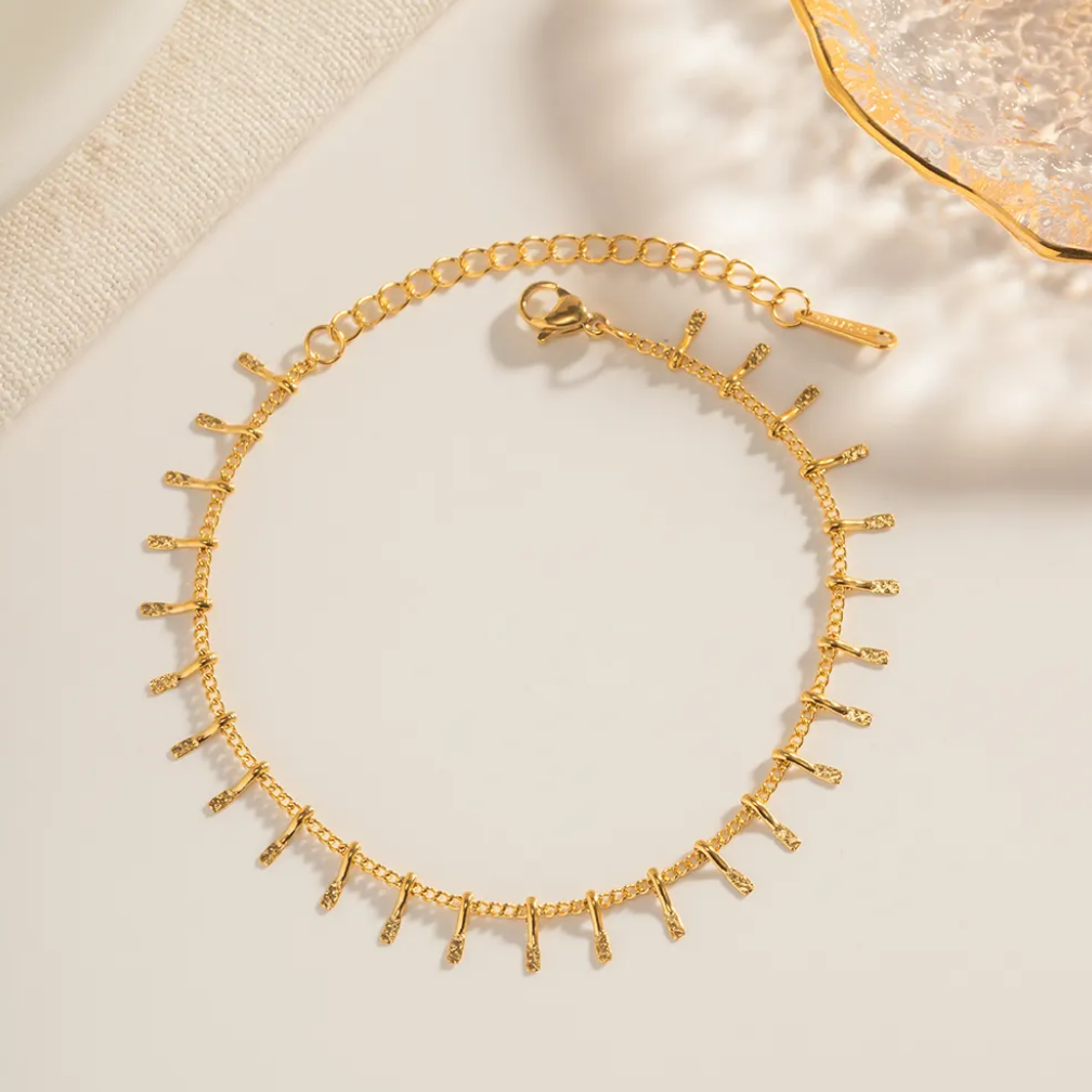 If you are searching for a fun and unique piece, look no further. This Beam Bracelet features stunning hammered tassel elements that exude charm and beauty with every movement. The way it reflects light is truly captivating, adding an extra layer of elegance to this already enchanting accessory.