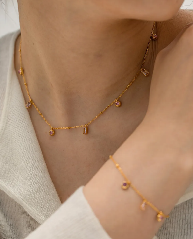 Meet the Pink Stone Charm Necklace — a dainty dream that dances with every step. This delicate chain is adorned with soft pink cubic zirconia charms in alternating circle and rectangle cuts, creating a graceful rhythm of sparkle and shape. Light as air and full of movement, it sits beautifully around the neck, catching the light and turning heads without saying a word. It’s the kind of piece that feels barely there, but looks unforgettable — feminine, fluid, and effortlessly elegant.