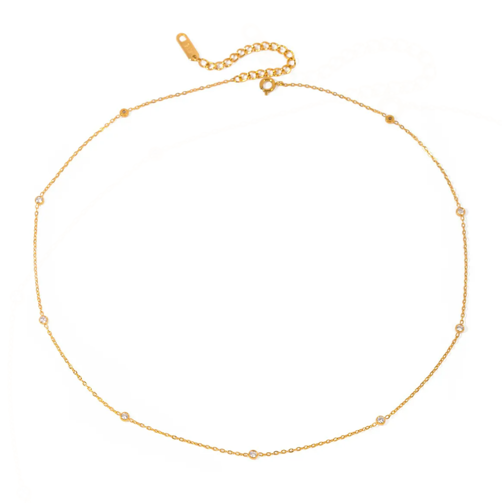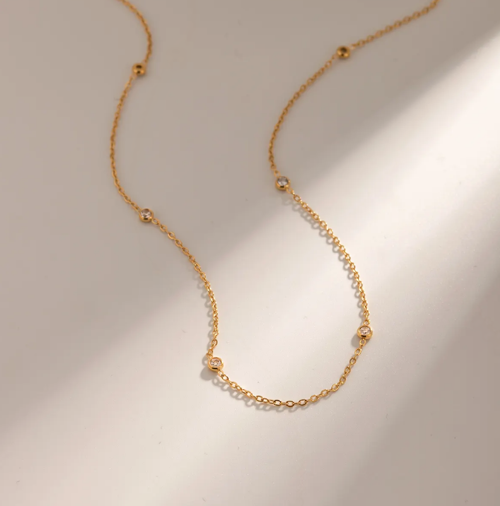 She’s not flashy—but she is unforgettable. This delicate chain is scattered with tiny cubic zirconia, like little sparks caught mid-air. It catches the light just enough to draw the eye, but never tries too hard. It’s that kind of effortless charm—quiet, glowy, and perfect on its own or layered with your other favourites. Subtle? Yes. Stunning? Absolutely.