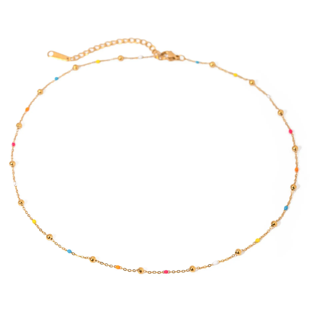 This one’s pure delight—dainty, golden, and dotted with tiny bursts of colour. Alternating enamel and gold beads give it a playful rhythm, like sprinkles on a chain. It’s the kind of piece that makes you smile when you catch it in the mirror. Light, easy, and full of personality—it’s subtle joy, strung in gold.
