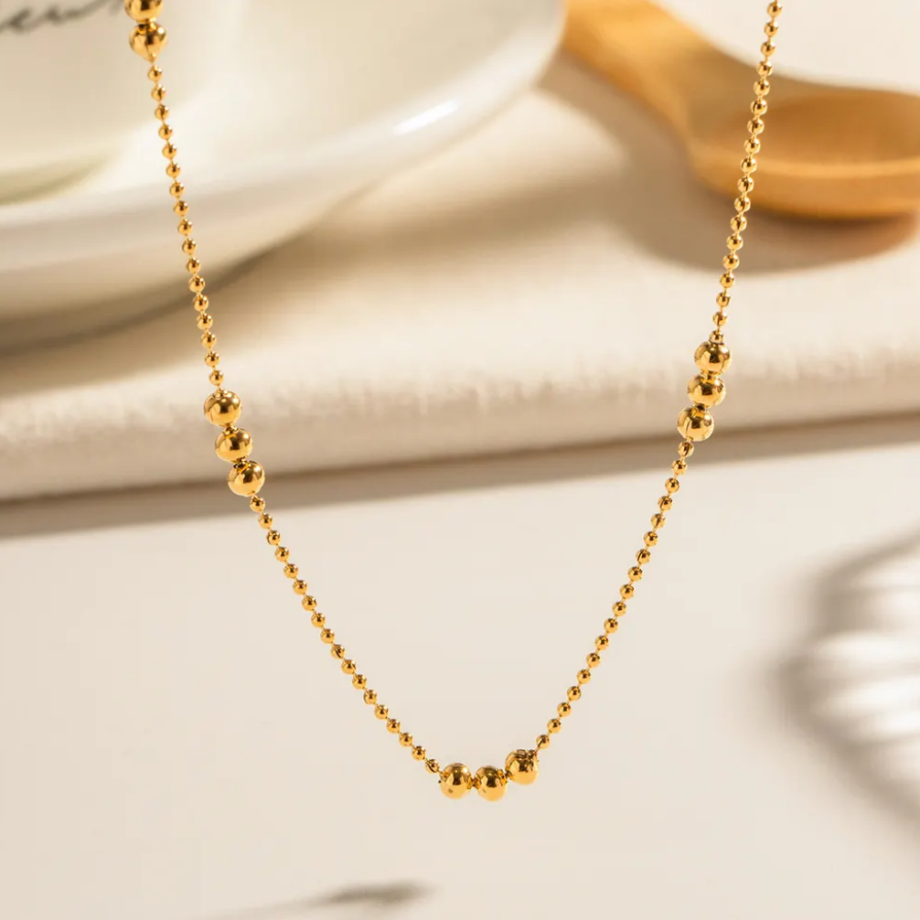 Simple, but it knows what it’s doing. This necklace features a repeated trio of golden beads spaced along a fine chain—clean, balanced, and just the right amount of detail. It’s the kind of piece that was made for a classic tee, an open collar, or a slick bun moment. Quietly refined, totally wearable, and somehow always the right choice.